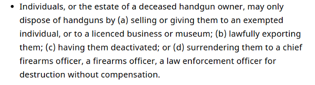 Under the current laws and regulations restricted and prohibited handguns may only be disposed in accordance with the info in the excerpt from RCMP website below: